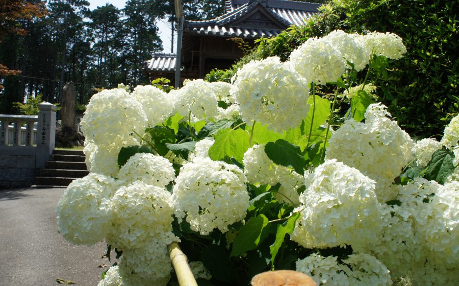 あじさい神社として親しまれており、境内には紫や青、ピンクのあじさいが咲き、梅雨空に鮮やかな色彩を彩っています。