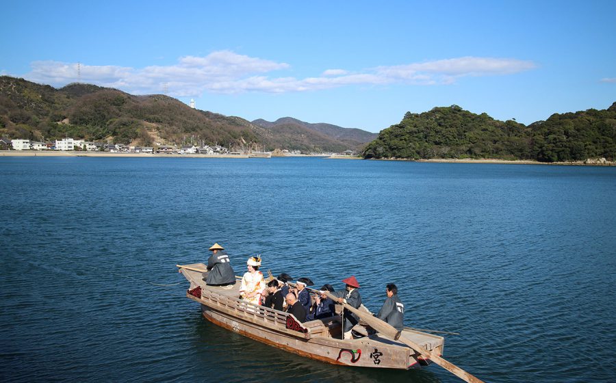 かつて道路が未整備だった坂越地区で、昭和初期まで続いていた婚礼行事。花嫁らを乗せた伝馬船が坂越湾を走り、歴史豊かな町並みを歩いて花婿宅に向かうというもの。地元の風習を伝える行事として、数年前から復活しました。