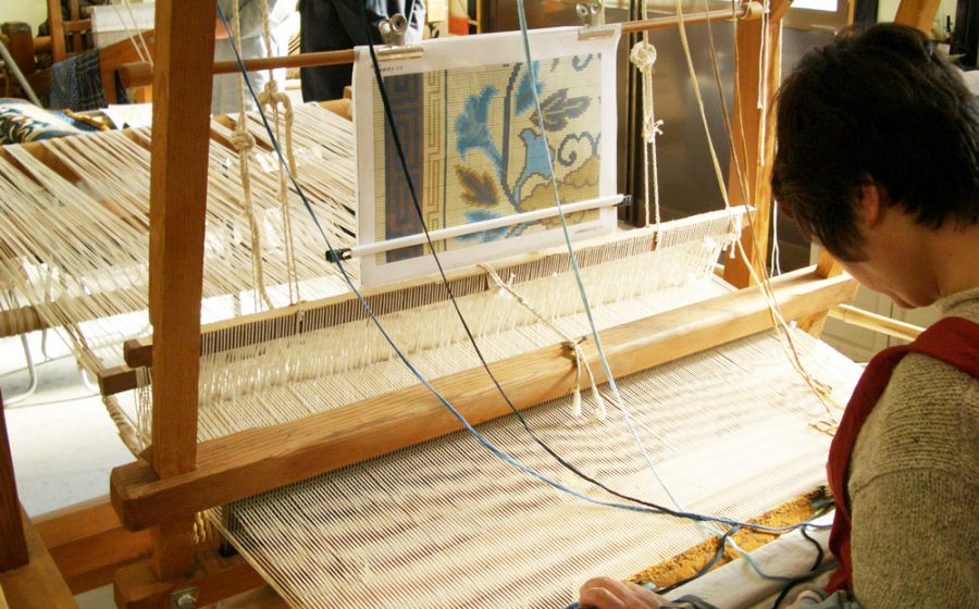 赤穂緞通(あこうだんつう)は、江戸時代末期、「児島なか」によって考案されました。すべて手作業によるもので、その独特な色合いと文様は当時の人気を得、皇后の御召列車や東宮の御船、枢密院玉座の敷物として利用されるなど、堺、鍋島と並ぶ三大緞通に発展しました。戦後復活し、その織方技法は赤穂市指定文化財にもなりました。加里屋工房では織る様子を見学でき、機織体験もできます(有料)。